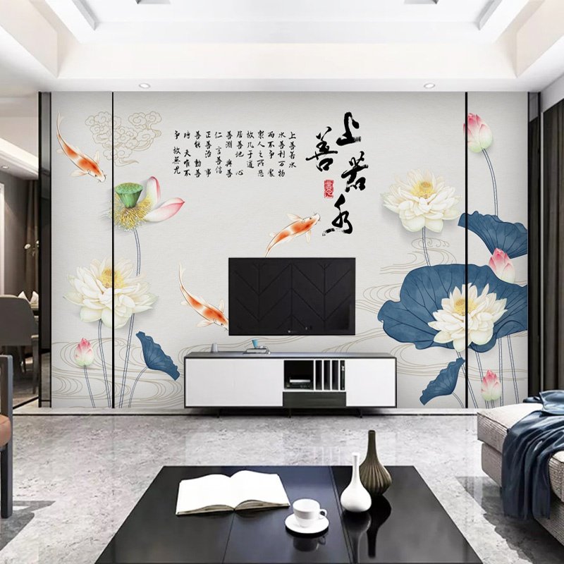 电视背景墙壁纸新中式工笔荷花图5d上善若水艺术壁画卧室墙纸墙布热门设计联盟服务商